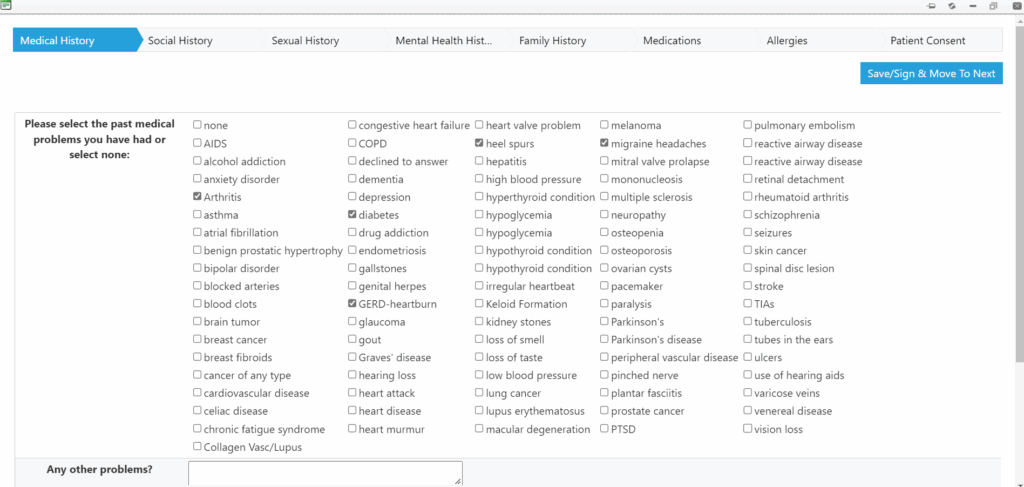 Text, email, portal or in office intake demographics, AI insurance card reader, medical history, and problems, medications. Collect credit cards. Sign consents. Automatic import all the data.
