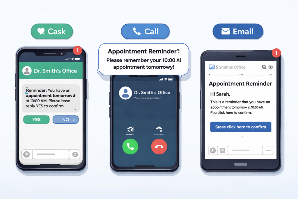 Text, email, voice call and app notification for appointments, televisits, tasks, birthdays, custom messages, statements, prescriptions, and labs.