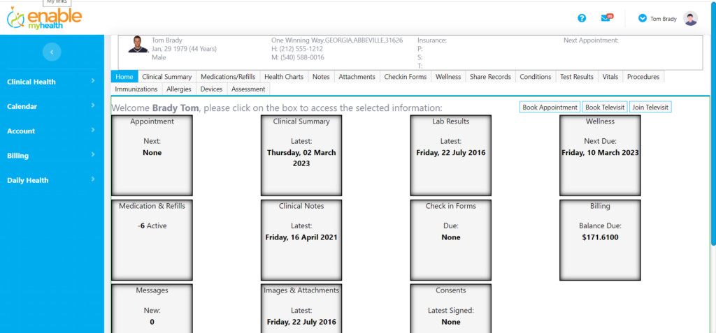 Patient and Provider portal. Patients can access their clinical summaries, notes, reports, vitals, test results, track health and vitals, complete intake forms, access televisits, send messages, securely chat, pay bills and update insurance.