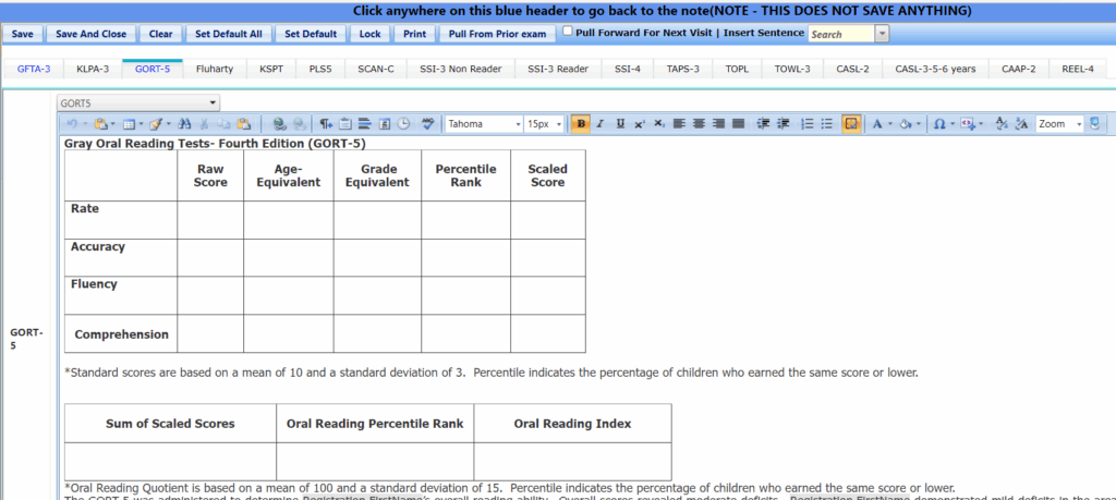 Pediatric and Adult Speech Therapy SOAP note, Test Evaluations, and dynamic short and longer term goals. GFPT-3, KLPA-3, GORT-5, Fluharty, KSPT, and many more.